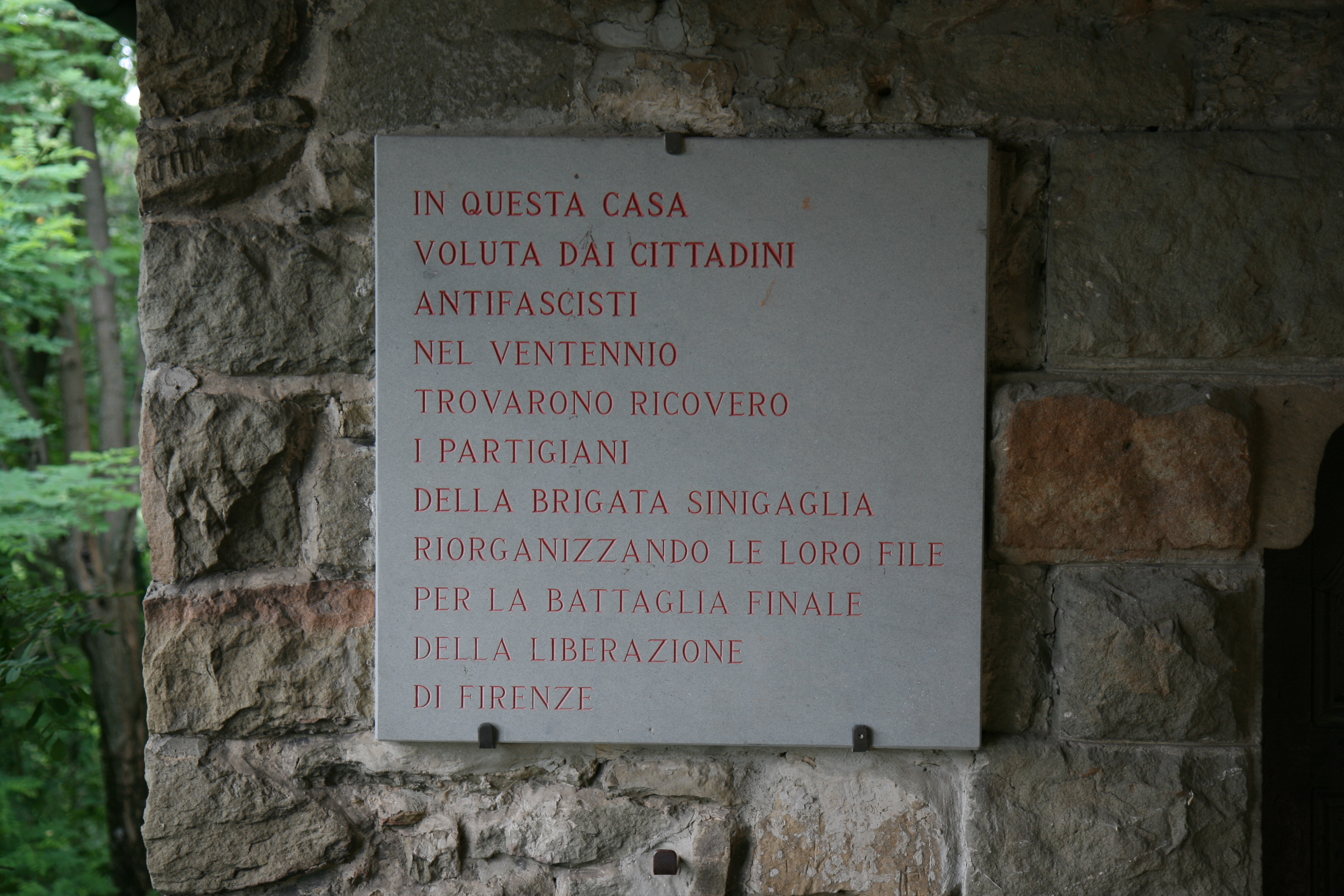 La lapide si trova sul rifugio di Fonte Santa, lo si raggiunge da San Donato in Collina seguendo via Maremmana e le indicazioni per Fonte Santa.